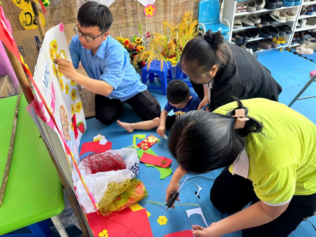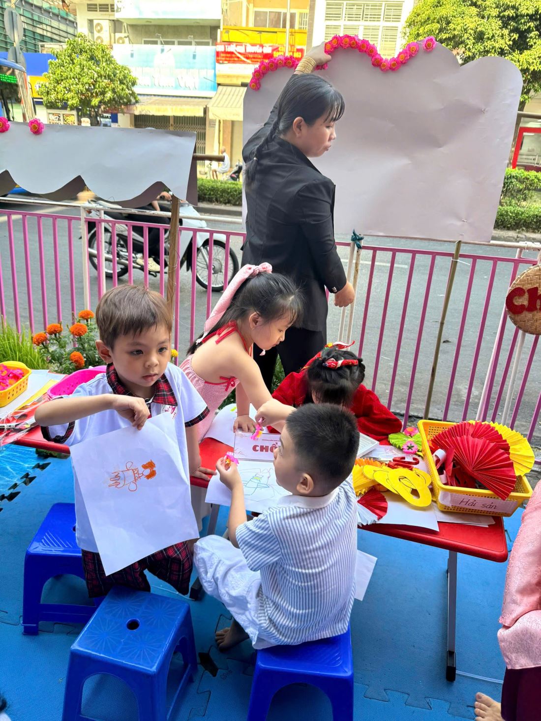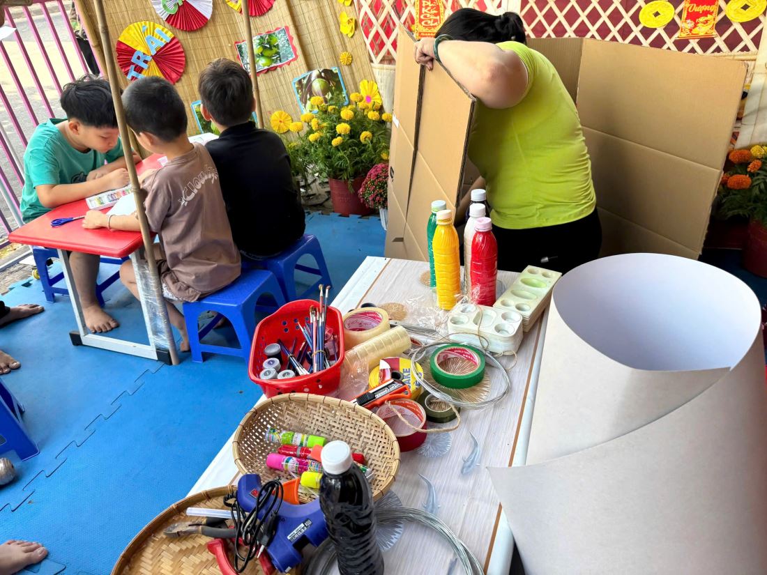 Mỗi lớp đảm nhiệm trang trí một gian hàng với những nguyên vật liệu do Nhà trường chuẩn bị sẵn. Dưới sự hỗ trợ tận tâm của các Thầy Cô và đại diện Hội Phụ Huynh, các con được tự tay tham gia từ khâu dựng khung quầy, cắt dán, tô vẽ cho đến trang trí từng chi tiết nhỏ xinh 🥰