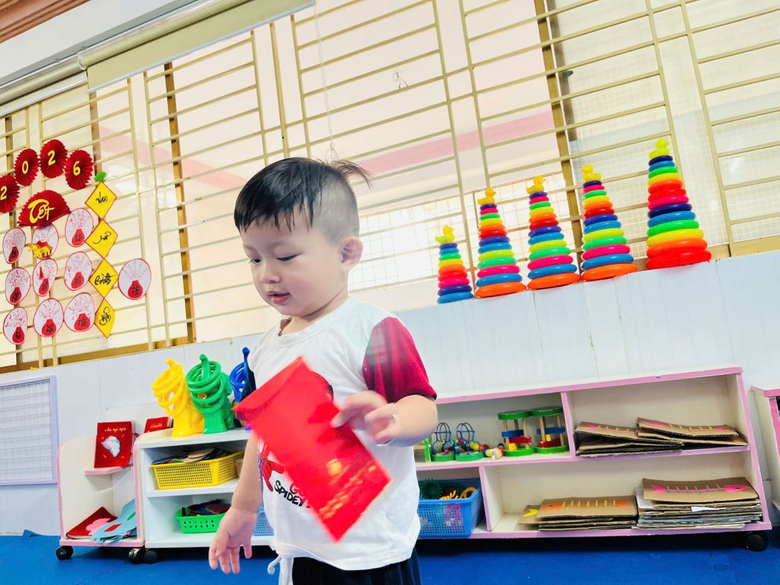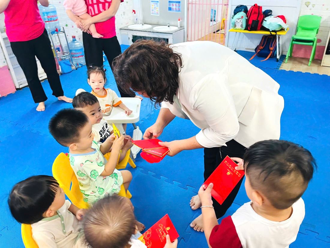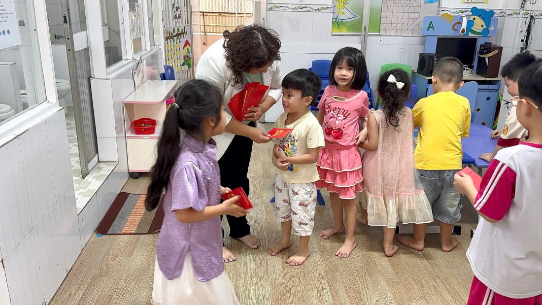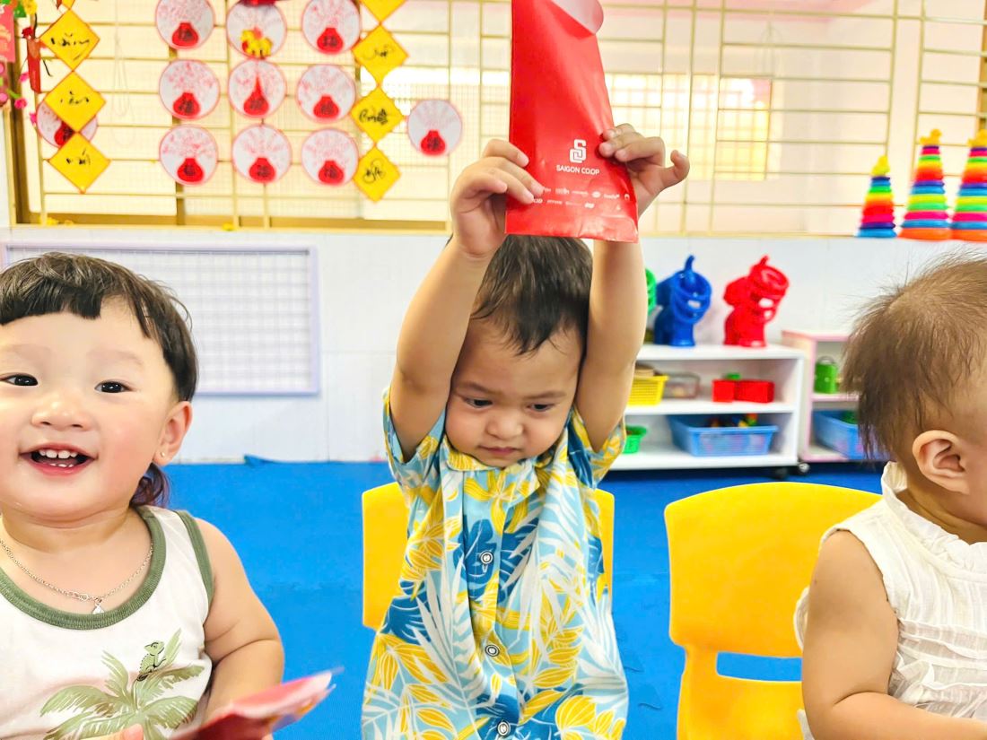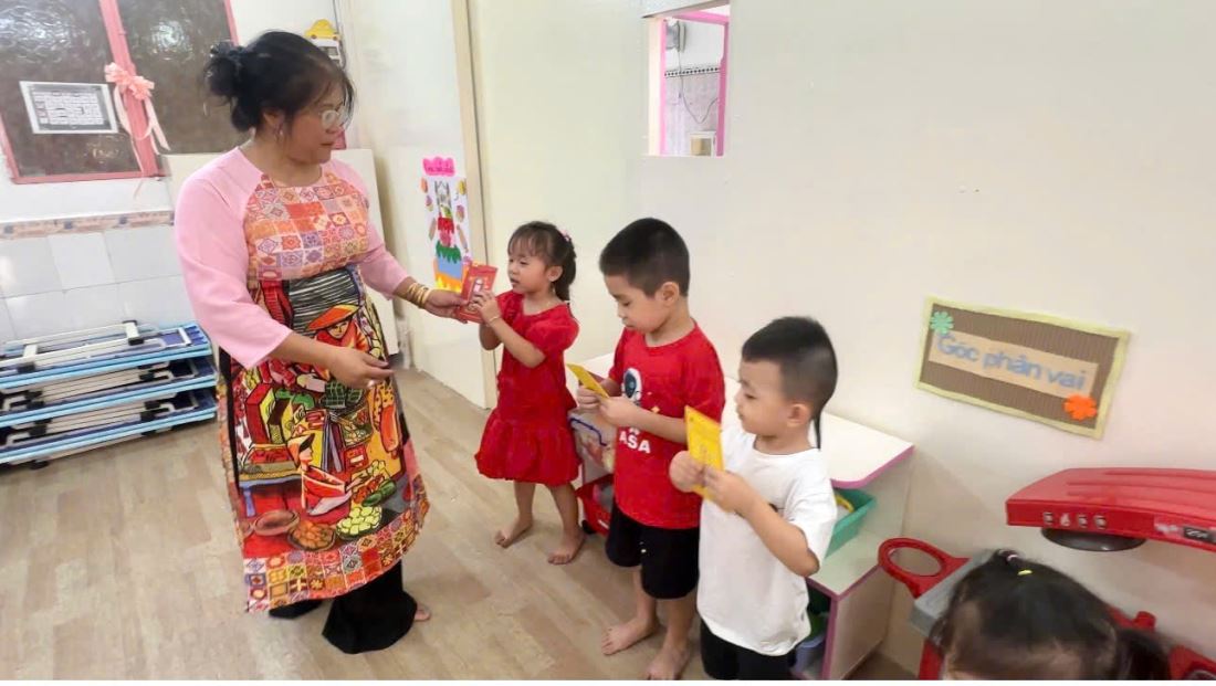 Cô dạy các con đưa hai tay nhận lì xì và lễ phép nói lời cảm ơn, bé lớn hơn thì xếp hàng chúc Tết cô giáo. Các con ôm bao lì xì trong tay vui cười tít mắt, ghét ơi là ghét luôn