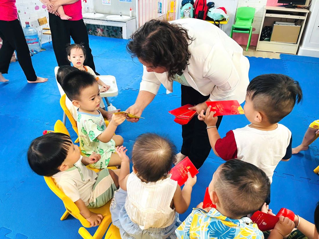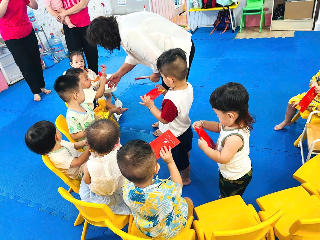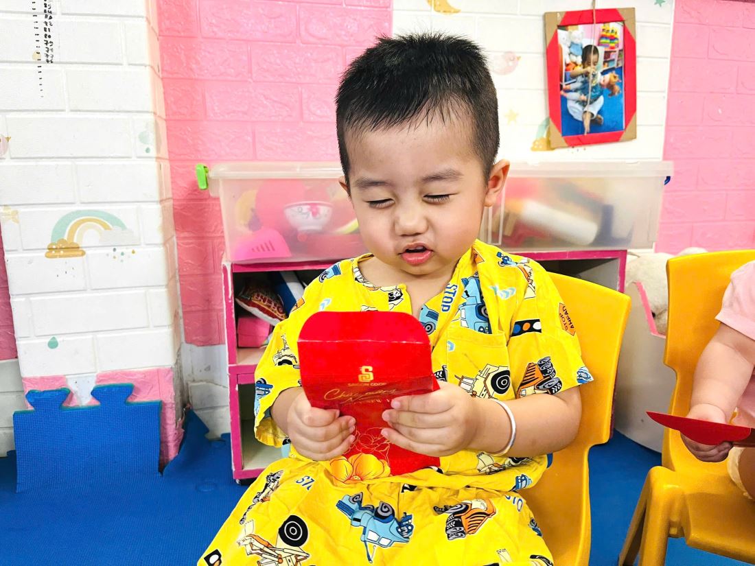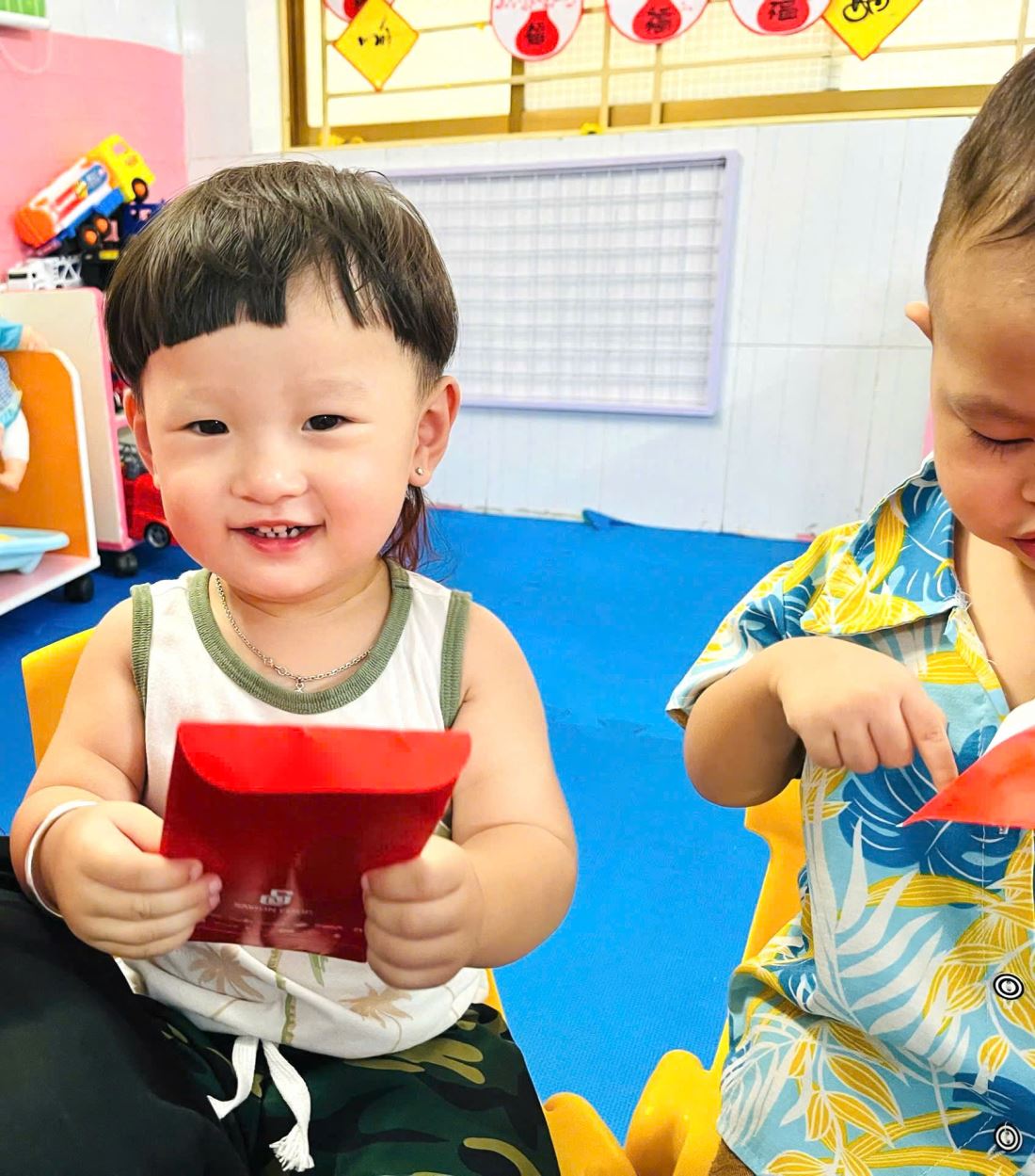 Cô dạy các con đưa hai tay nhận lì xì và lễ phép nói lời cảm ơn, bé lớn hơn thì xếp hàng chúc Tết cô giáo. Các con ôm bao lì xì trong tay vui cười tít mắt, ghét ơi là ghét luôn