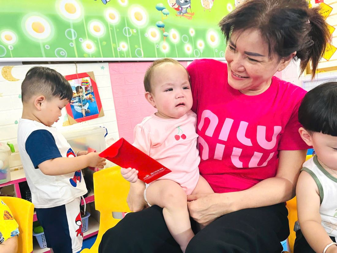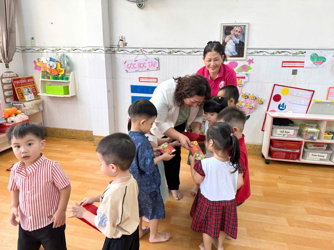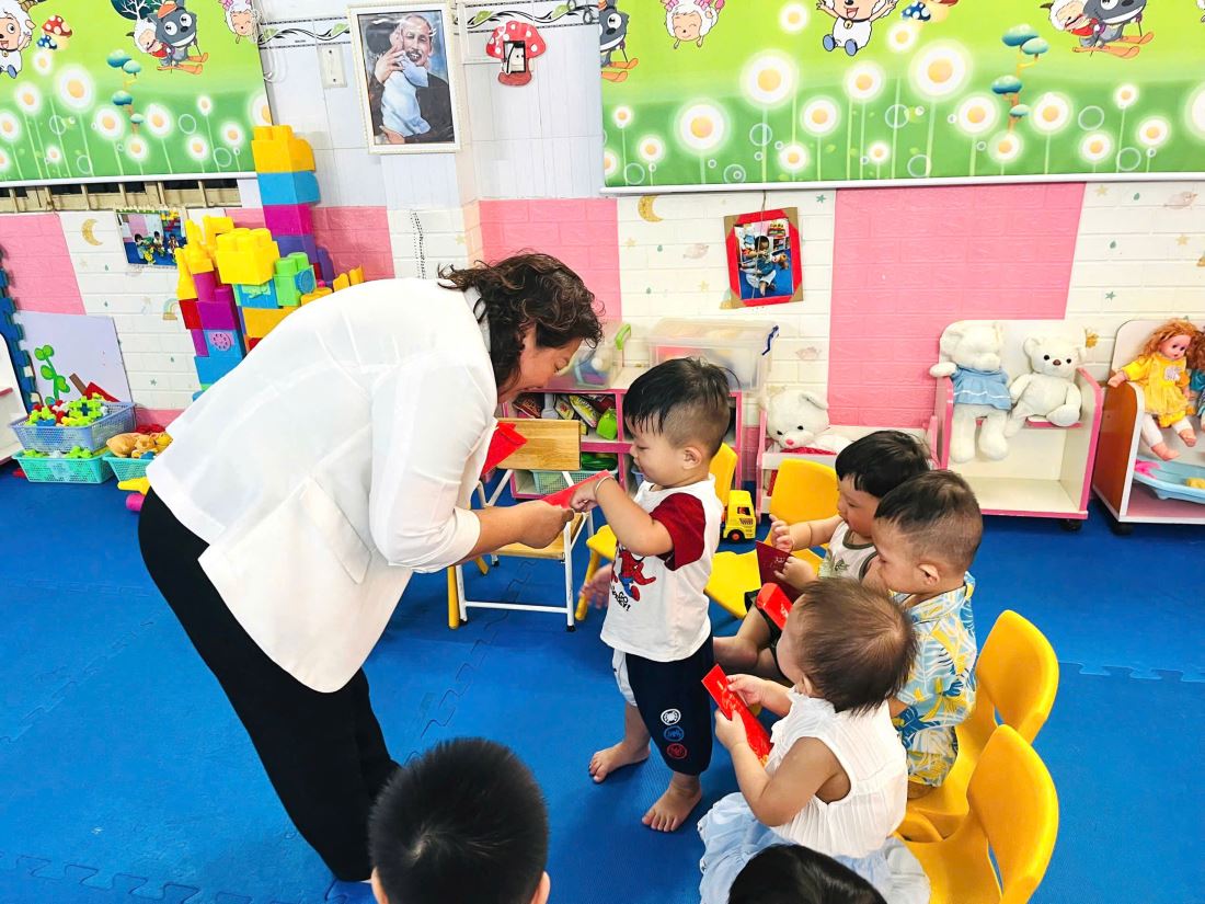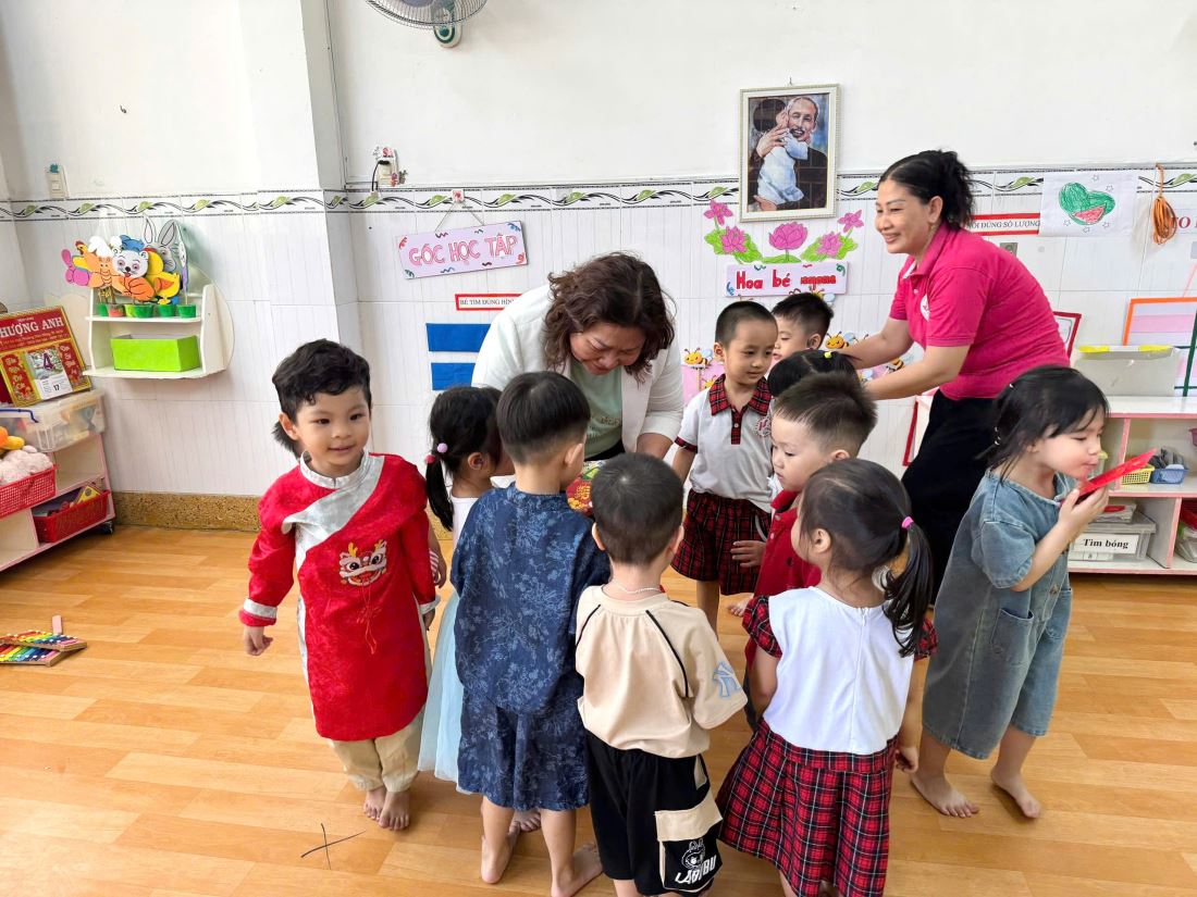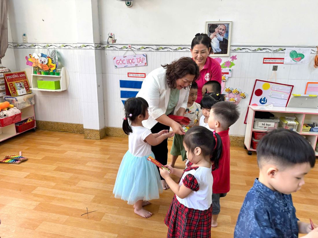 Cô dạy các con đưa hai tay nhận lì xì và lễ phép nói lời cảm ơn, bé lớn hơn thì xếp hàng chúc Tết cô giáo. Các con ôm bao lì xì trong tay vui cười tít mắt, ghét ơi là ghét luôn