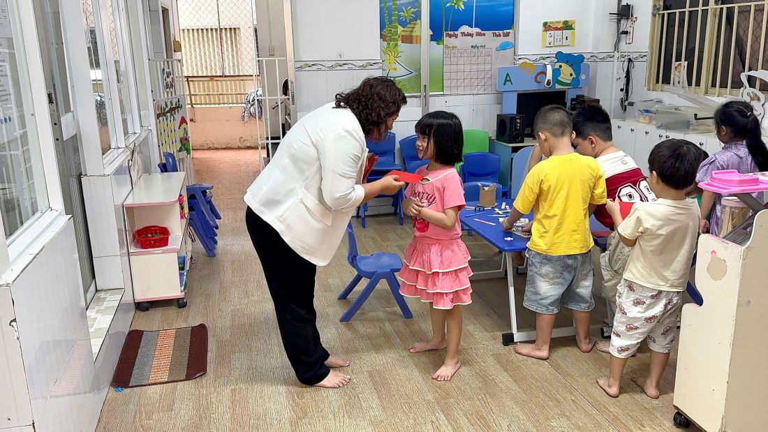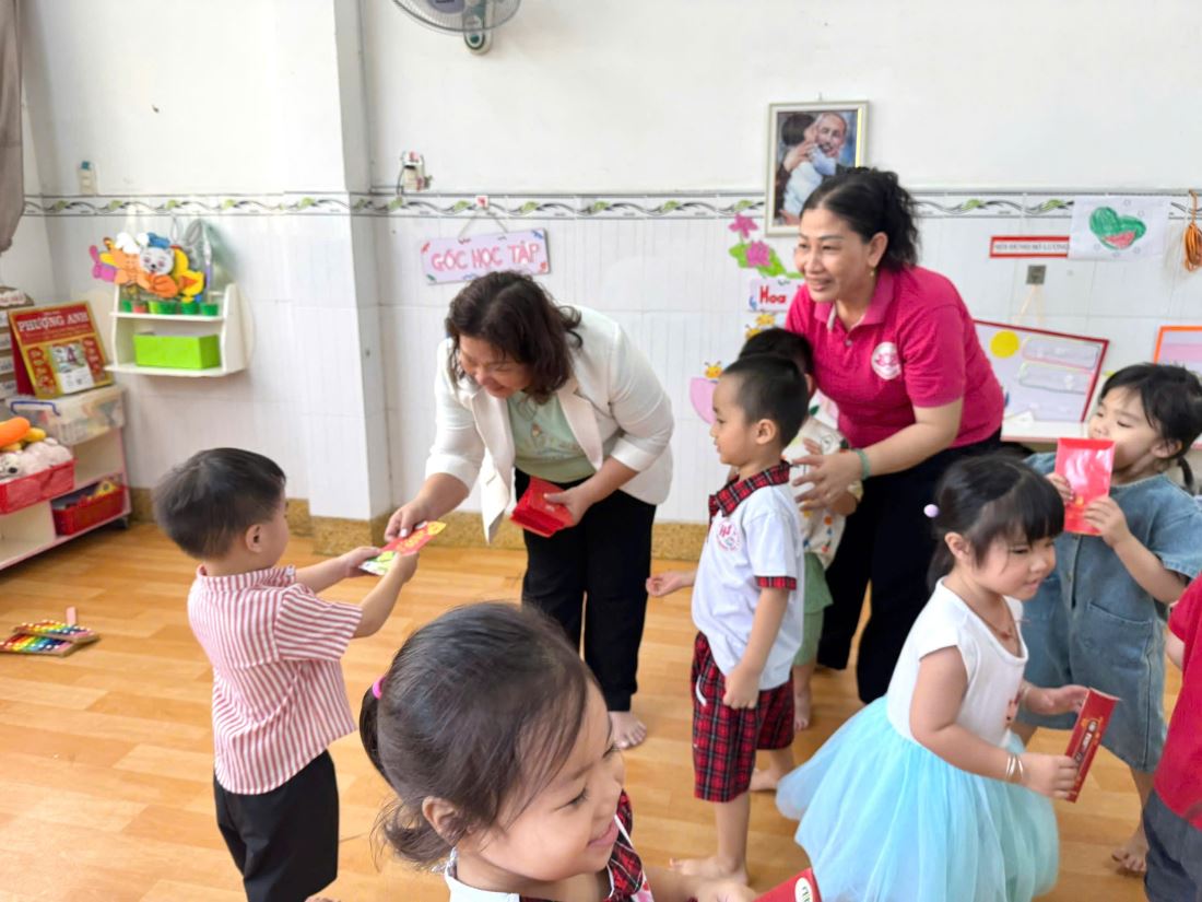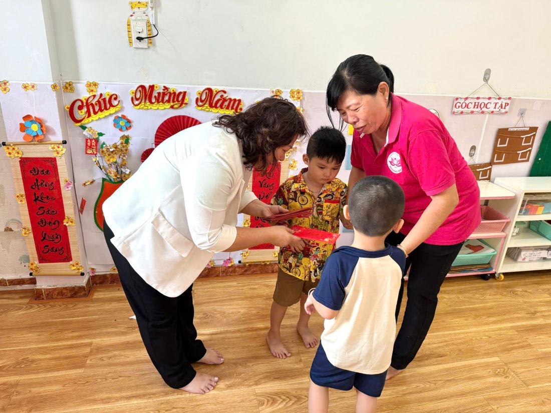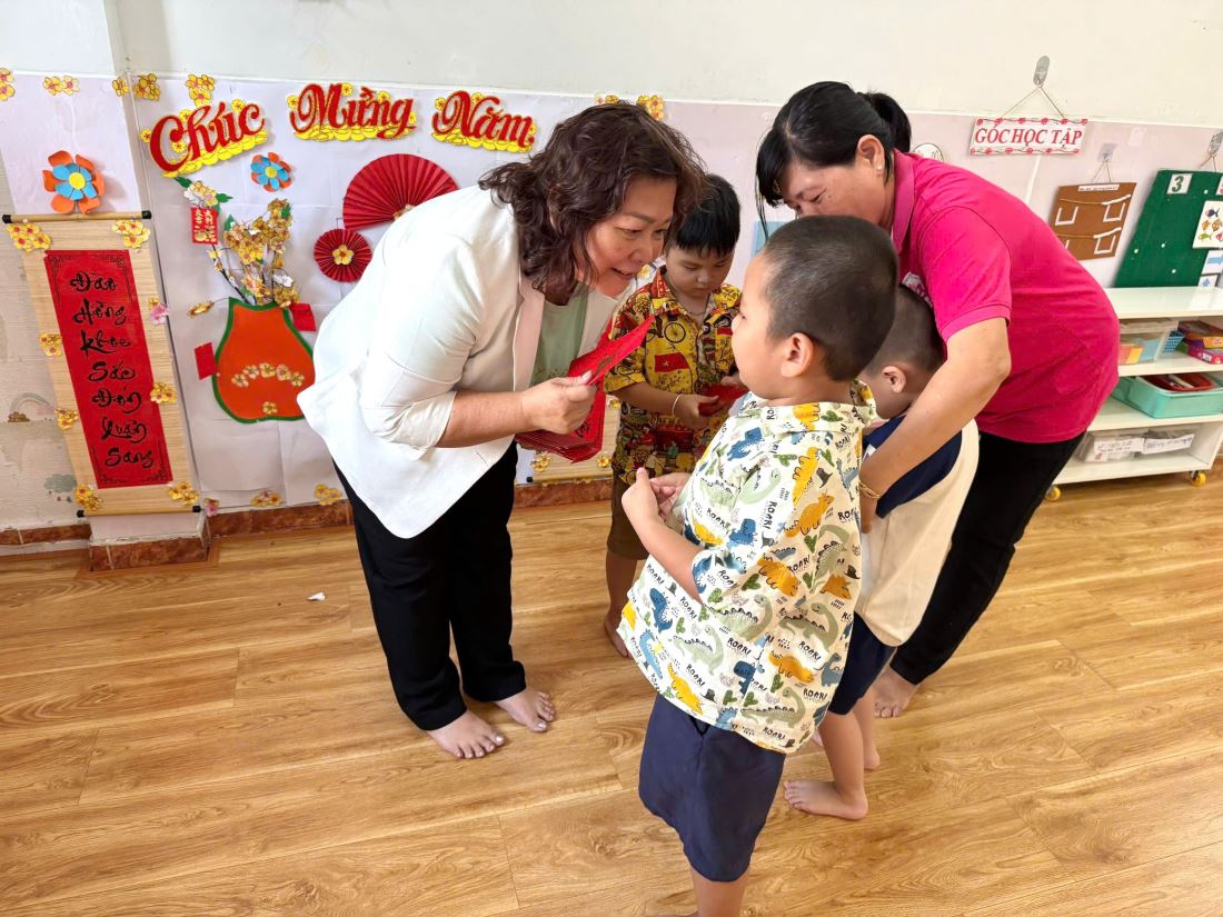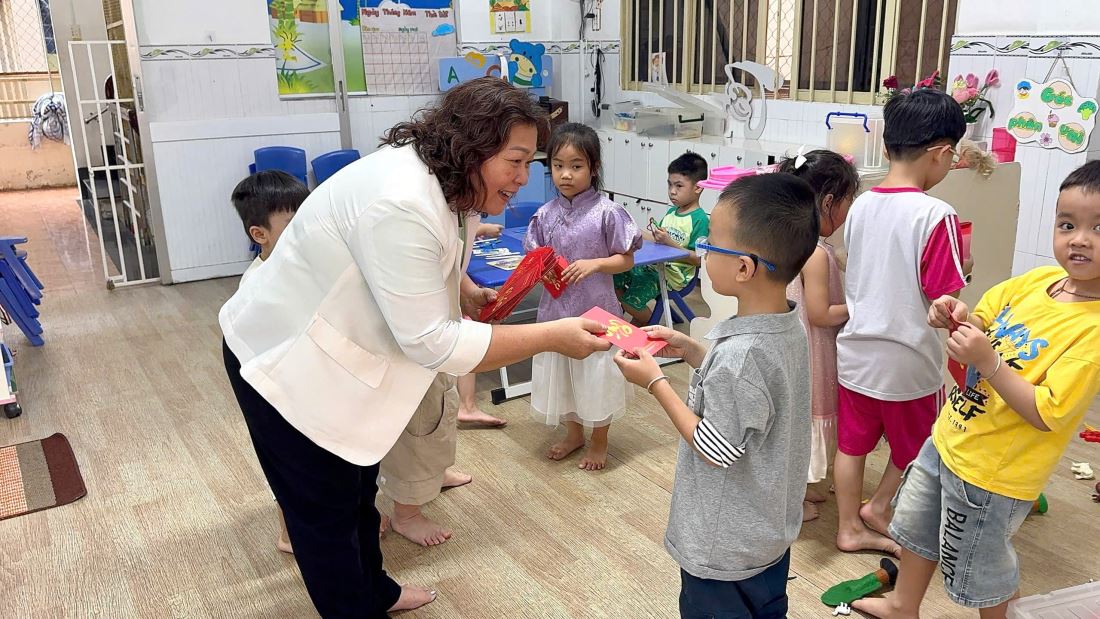 Cô xuất hiện với những bao lì xì đỏ xinh trao tận tay từng bạn nhỏ