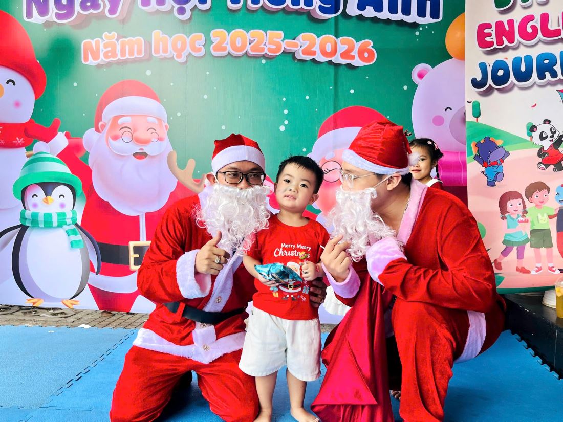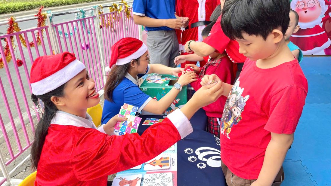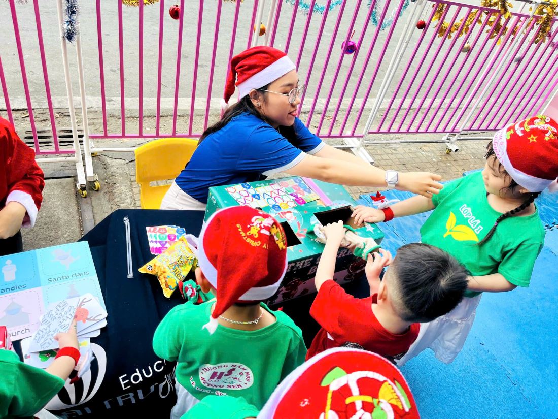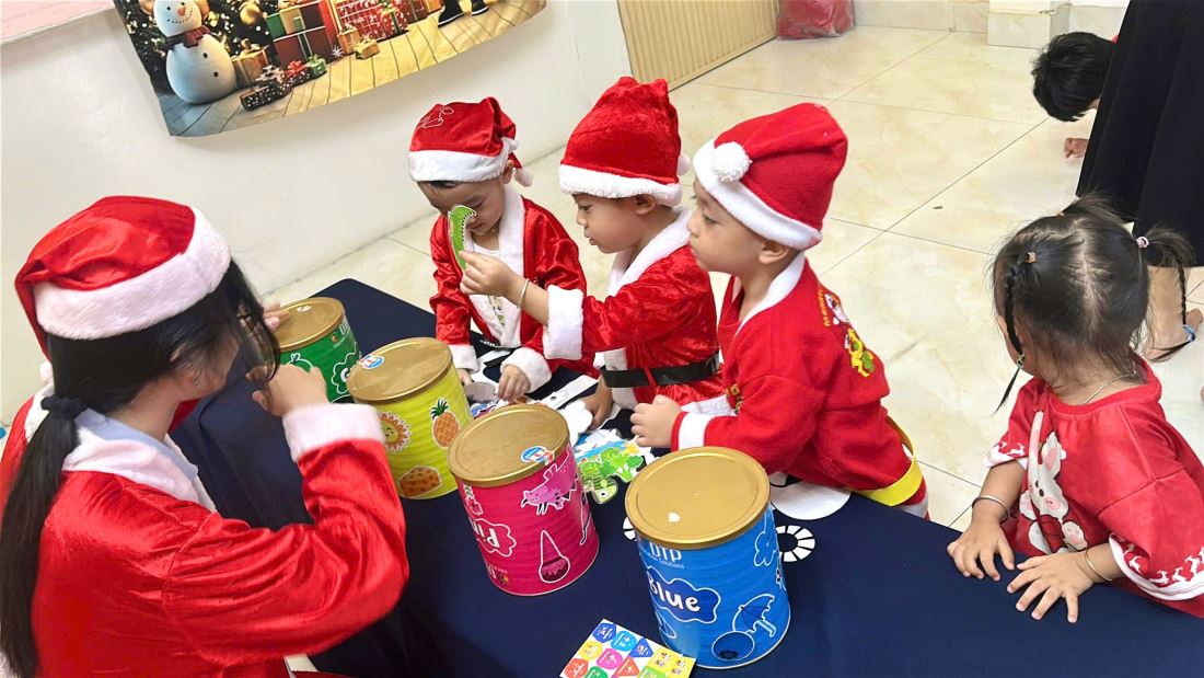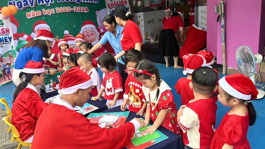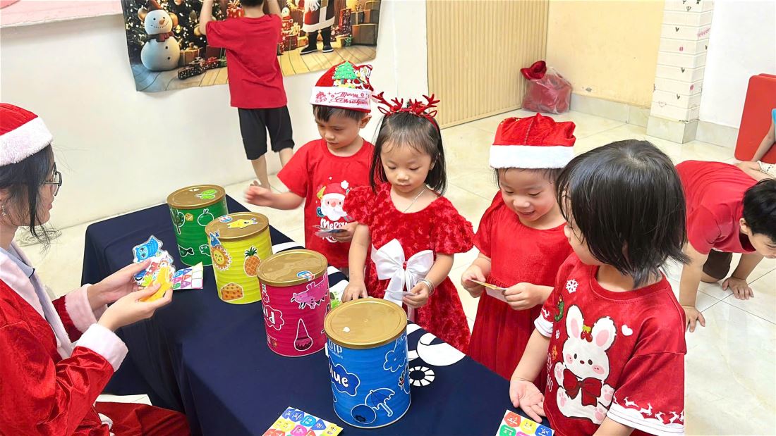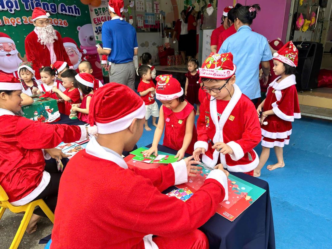Các bạn nhỏ hào hứng vượt qua những “trạm” thử thách Tiếng Anh đầy thú vị, thỏa sức sáng tạo tại các góc workshop như làm tranh cát, tô tượng, câu cá… Không khí càng thêm sôi động với những tiết mục văn nghệ đáng yêu và khoảnh khắc thích thú khi các con nhận được quà từ ông già Noel