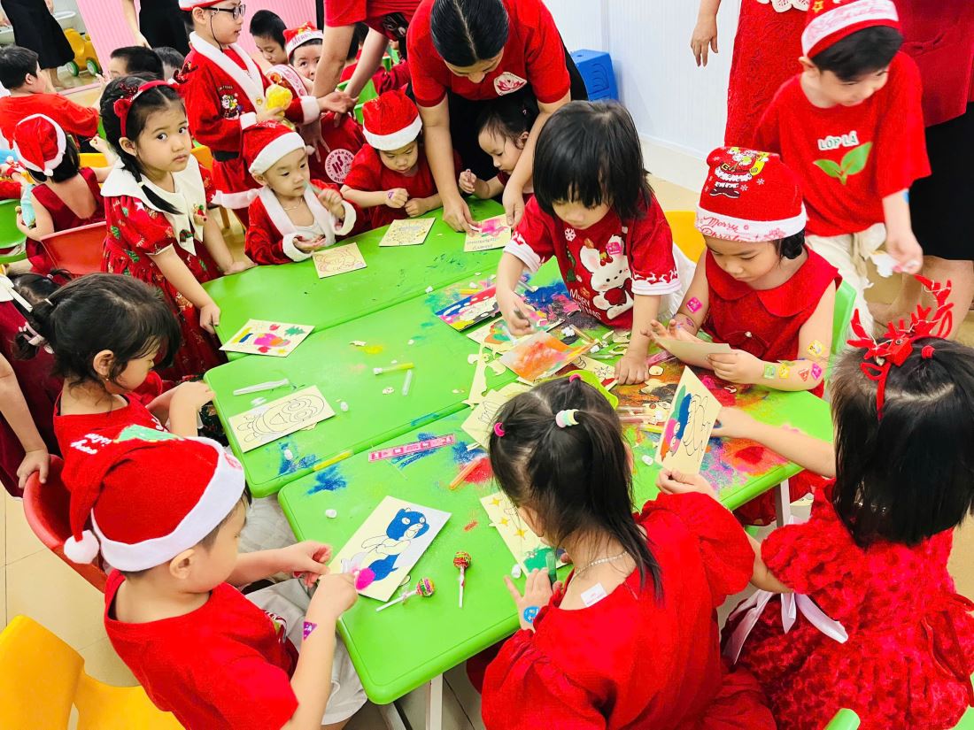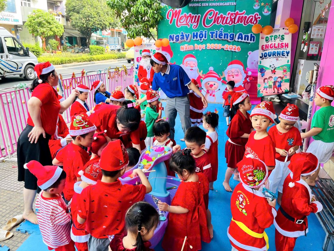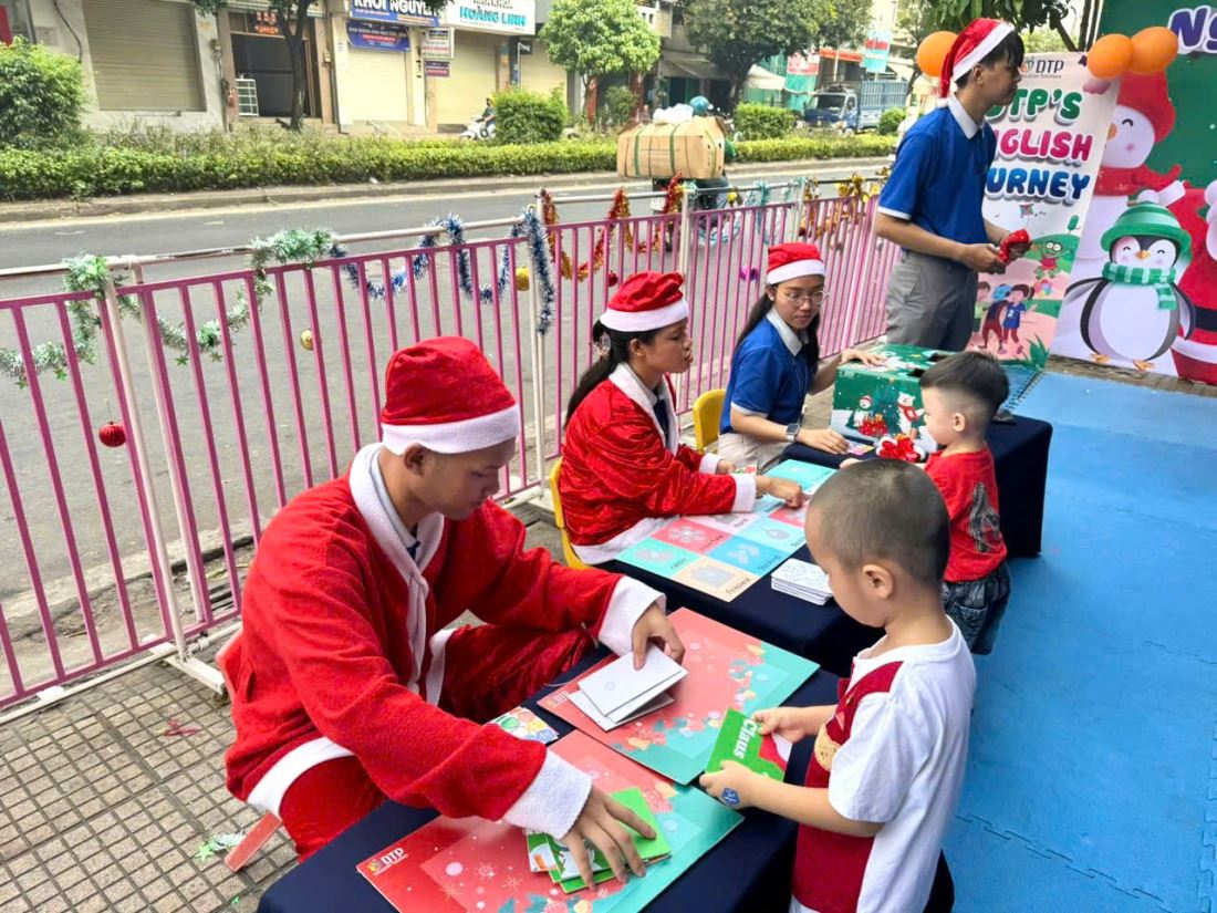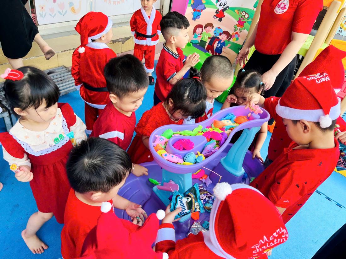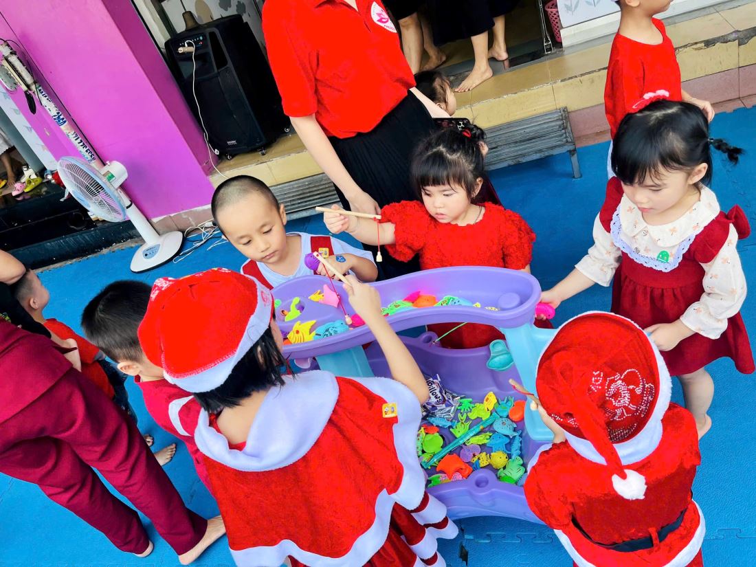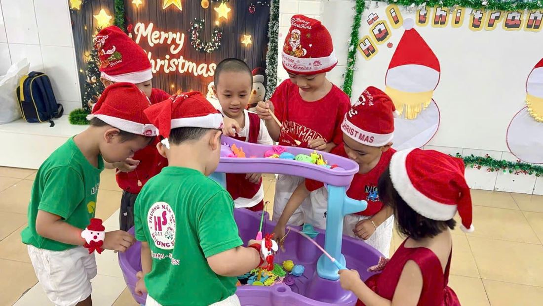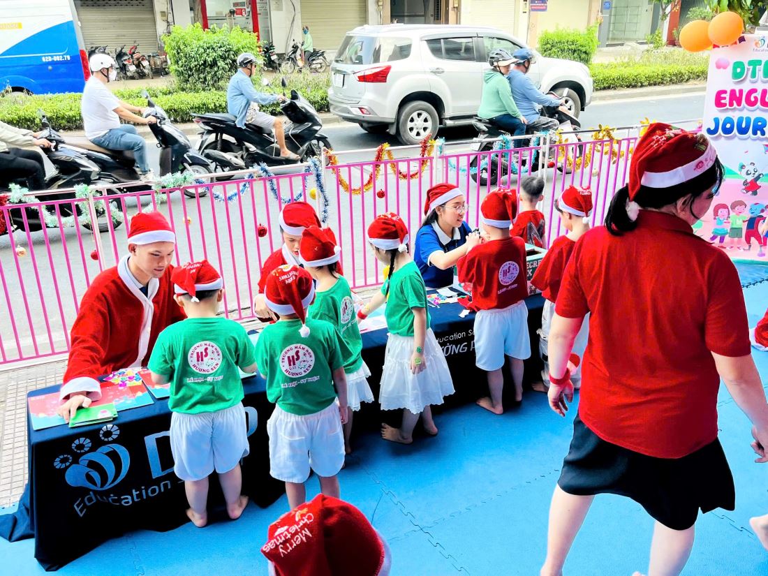 Các bạn nhỏ hào hứng vượt qua những “trạm” thử thách Tiếng Anh đầy thú vị, thỏa sức sáng tạo tại các góc workshop như làm tranh cát, tô tượng, câu cá… Không khí càng thêm sôi động với những tiết mục văn nghệ đáng yêu và khoảnh khắc thích thú khi các con nhận được quà từ ông già Noel